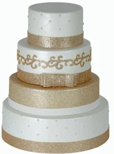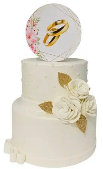 Esse bolo de casamento vem com detalhes em dourado e mede 35cm de altura