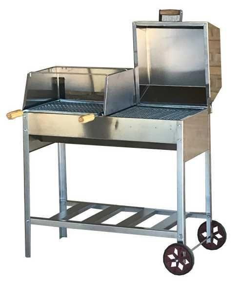 Churrasqueira mista - esse modelo tem uma grelha sem tampa, ótima pra assar pão de alho, queijo coalho e bifes mais finos. Aí, do lado tem a parte com tampa pra preparações a bafo.