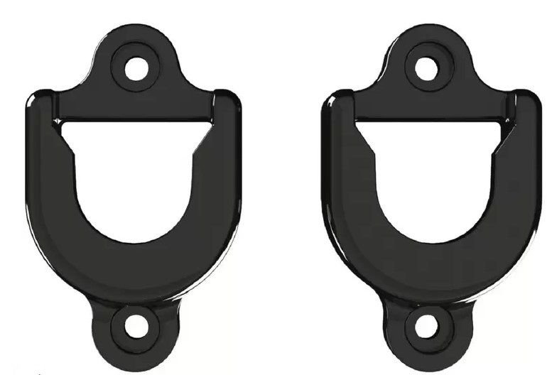 Agora, o modelo de régua dupla, por exemplo, é uma chapa retangular, com vários pontos de fixação e um grande reforço, bom pra TVs pesadas.