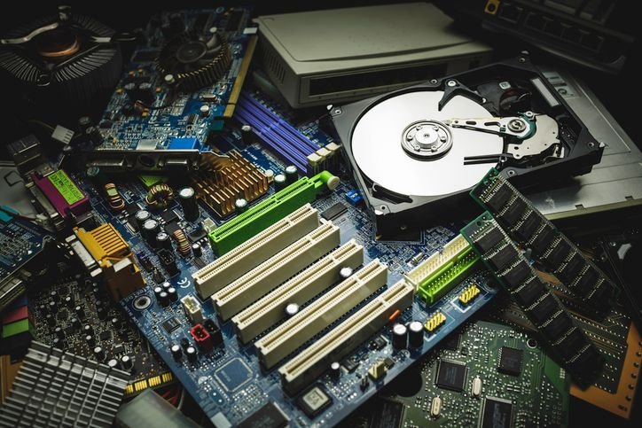 Placa-mãe de computador com componentes diversos como processador, memória RAM, disco rígido e circuitos eletrônicos, essencial para montagem e manutenção de computadores.