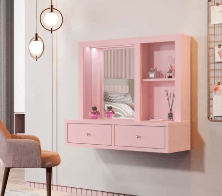 Prefira móveis como guarda roupa com penteadeira, cômoda penteadeira em linhas retas com gavetas mais finas. Dê preferência a kits de penteadeira camarim com cadeira dobrável.