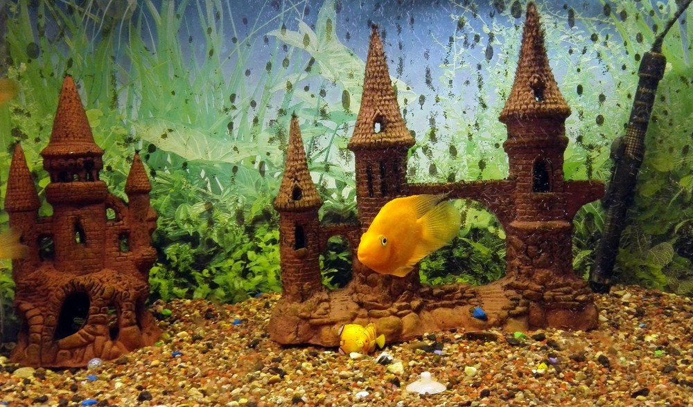 Os enfeites de aquário são feitos em cerâmica ou resina e, quando pintados, é usada tinta não tóxica. Por isso que não pode colocar o brinquedo de uma criança, dentro do aquário.