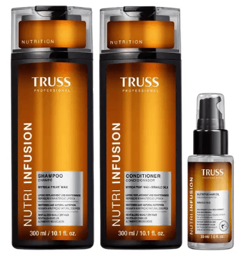 Por exemplo, você encontra conjuntos com 300ml de condicionador, o mesmo tanto de shampoo, 180g de máscara e 30ml de óleo. São o melhor kit de cabelo pra quem tem cortes curto ou gosta de trocar o tipo de hidratação Truss quando os cremes acabam.