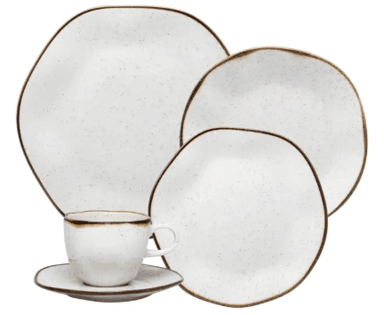 Se engana quem pensa que aparelho de jantar só tem aquele formato tradicional redondo! Hoje tem opções quadradas, retangulares e até com linhas orgânicas, que têm um design mais fluido e moderno.